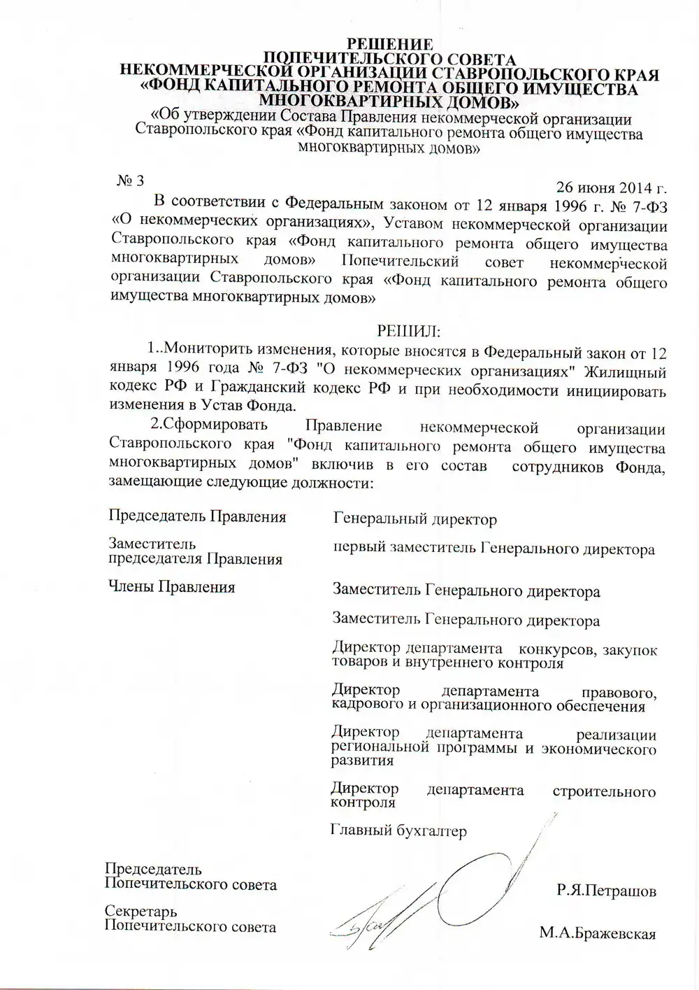 Правление некоммерческой организации Ставропольского края «Фонд капитального ремонта общего имущества многоквартирных домов» утверждено Попечительским советом Фонда решением от 26.06.2014 №3 «Об утверждении Состава Правления некоммерческой организации Ставропольского края «Фонд капитального ремонта общего имущества многоквартирных домов» (скачать).